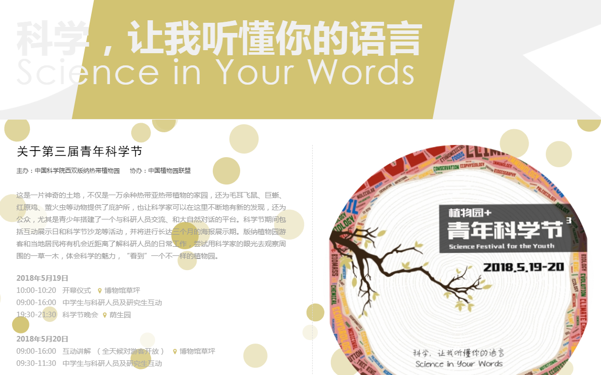 5月21日,版纳植物园第三届青年科学节以网络专辑的形式,在线公布了科学节的入围海报、“最受欢迎作品奖”和互动展示现场的图集。