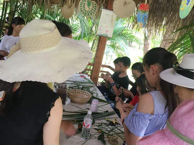 “棕榈知识问答”:棕榈植物会天然分叉吗?哪些棕榈植物的种子可以用来制作菩提手串?一个个有趣的问题使游客了解到海椰子拥有世界上最大的种子,浑身长刺的省藤却是上好的家具编织材料、贝叶棕刻写的贝叶经能保存上千年。“棕榈叶编织”吸引了众多亲子家庭的参与体验,手中的棕榈叶在科普老师的指导下编织出造型逼真的蚂蚱、憨态可掬却会咬人手指头的贪吃蛇、美丽别致的玫瑰花、小巧玲珑的小箩筐等物件。“蓑衣试穿”,游客穿上蓑衣戴上斗笠,感受古诗中“孤舟蓑笠翁”、“青箬笠、绿蓑衣”的意境。