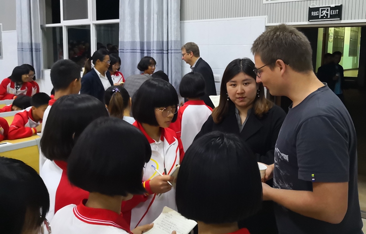 在者后中学报告大厅,埃尔郎根-纽伦堡大学的Achim Braeuning 教授结合自己多年来的研究工作,做了题为《生物多样性与可持续发展》的报告,希望同学们们长大之后热爱自然、保护自然;哀牢山生态站的博士研究生罗康结合自己近年来在哀牢山观测和拍摄到的大量图片和视频,做了题为《鸟类多样性和鸟类繁殖趣事》的报告,引起同学们浓厚的兴趣。科普报告结束后,者后中学的英语老师协助同学们与3名外籍科学家开展了英语互动交流。