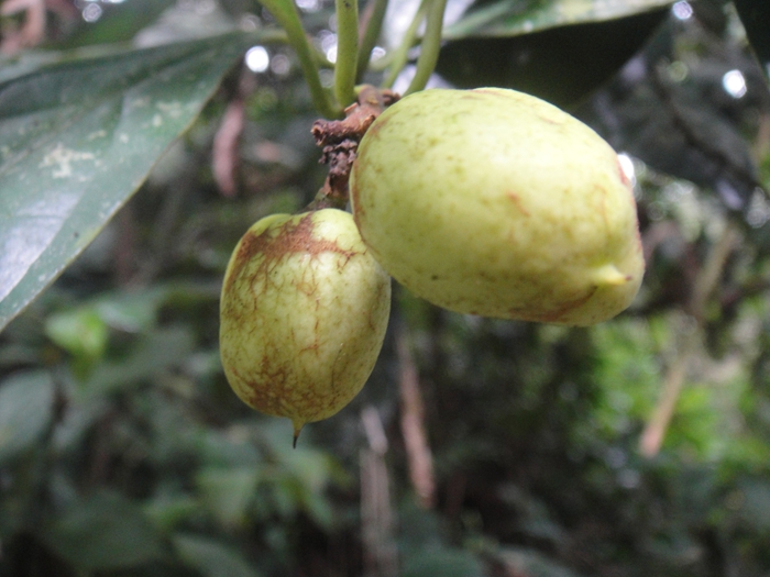 假海桐(Pittosporopsis kerrii Craib)是沟谷雨林中较为常见的一种小乔木,高4—7米;树皮红褐色,小枝近圆柱形,无毛,具稀疏的皮孔。叶长椭圆状倒披针形至长椭圆形,先端渐尖或钝,基部渐狭,长12—22厘米,宽4—8.5厘米,两面无毛或背面沿中脉稍被毛;其花期为10月至翌年5月,花瓣匙形,白绿色至黄白色,具香味;果期为2至10月,果为核果状,长2.5—3.5厘米,径约2—2.5厘米,近圆形至长圆形,稍扁,生时绿白色,干时褐色,可以食用。如果直接生食,其果味较苦,但很快就会回甘,出现一种淡淡的甜味,令人舒爽;也可煮熟之后食用,虽苦味较淡却没有了回甘。