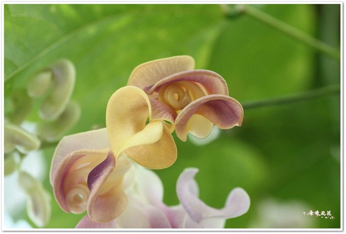 蜗牛藤为豆科家族豇豆属多年生常绿藤蔓植物,因花蕾形似蜗牛那低圆锥形的壳,故得名Snail Vine(蜗牛藤),蜗牛藤为总状花序,单花总长4-7cm左右,花梗长约5-15mm。花蕾期为白色或乳白色,旗瓣的背面为紫色,随着花蕾逐渐绽放,龙骨瓣盘绕旋转,由尖尾端向后螺旋扭转渐开,白色部分逐渐变为橘黄色,紫色部分颜色不变。开花时,螺旋形的开法形如红酒开瓶器,所以又有Corkscrew Flower(螺旋花)之称。它最高可生长到7-8m,花期7-9月,原产南美和中美洲热带地区。
