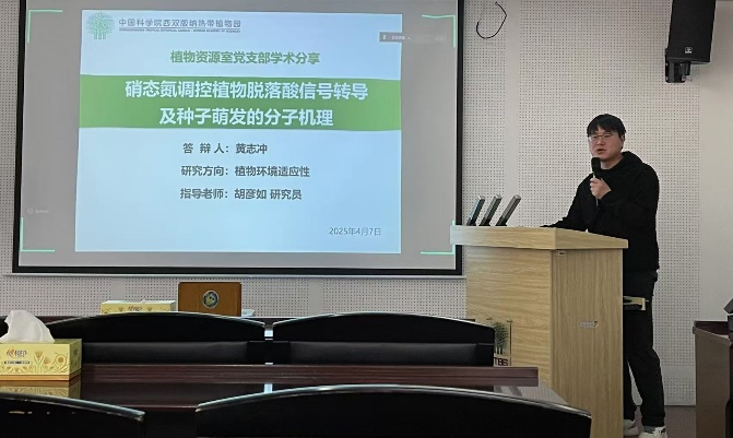 最后,党支部所属的“蔡希陶热带植物资源综合利用突击队”组织开展了科研分享活动。黄志冲同志以“硝酸盐调控植物脱落酸信号转导及种子萌发的分子机理”为题,作了一场精彩的学术报告,拓宽了大家的学术视野,激发了科研兴趣。