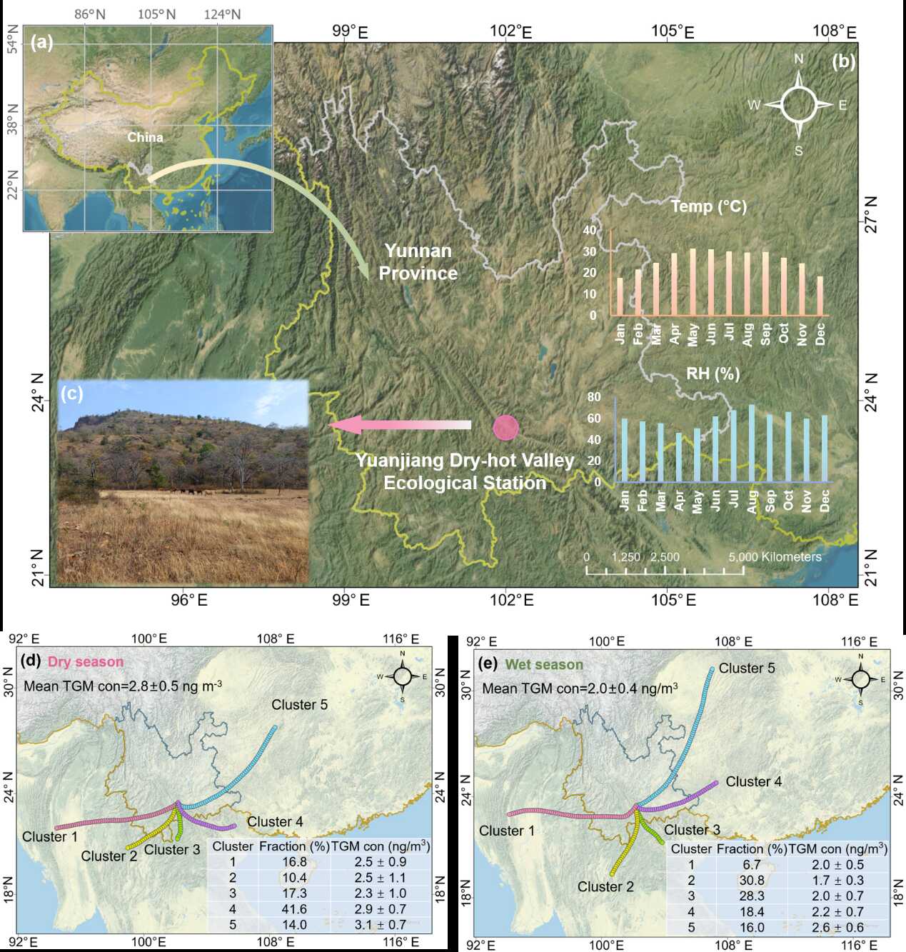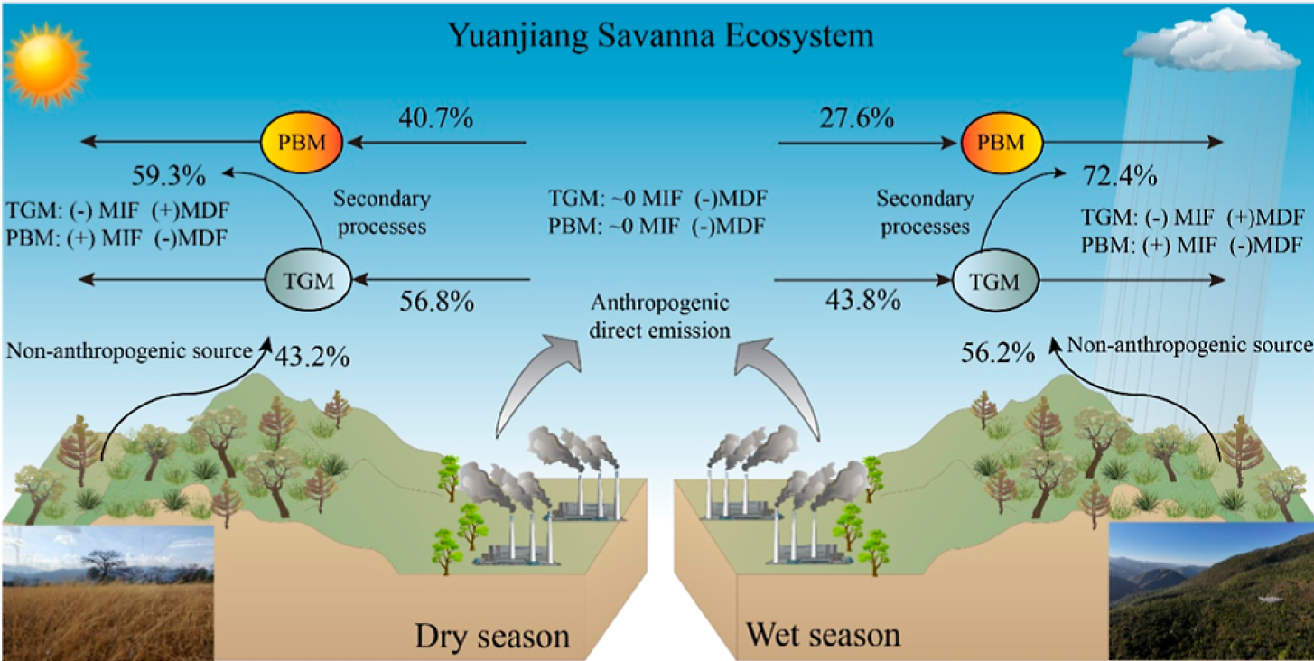 针对这一科学空白,中国科学院地球化学研究所环境地球化学国家重点实验室王训研究员团队联合中国科学院西双版纳热带植物园等单位,以中国西南典型热带稀树草原——元江干热河谷生态站为研究平台,基于长期连续观测与汞稳定同位素示踪技术,系统解析了大气气态总汞(TGM)及颗粒态汞(TSP、PM2.5)的季节变化、来源贡献及颗粒物表面的氧化还原过程。首次在中国西南典型热带稀树草原生态系统中系统阐明了大气汞来源及其颗粒相转化机制,为完善稀树草原生态系统乃至全球汞同位素模型提供了关键观测约束。主要研究结果如下:
