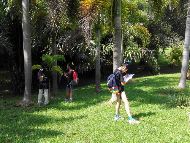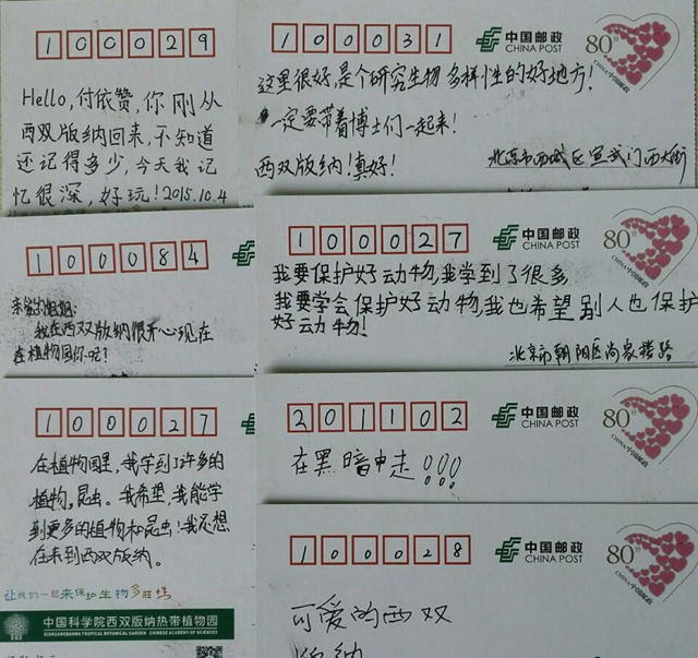 首先,通过开营仪式,环境教育人员向营员介绍了版纳植物园的三大功能,围绕活动中如何照顾自己、他人和环境,引导营员制定了营规。在问候雨林主题活动中,营员体验了生命树游戏,并用自然笔记创作了树木肖像——我的树朋友。美丽的自然给人以灵感,大家通过仔细观察,用心绘制了狐尾椰子等棕榈植物,有的还给自己的树朋友画出了阴影变化,有的则为树朋友增添了蜘蛛网、蚂蚁和蜻蜓等小动物,虽然风格各异,但各有所长,活动后大家还不约而同地收好自己的作品以作长久保存。其次,在自然艺术馆主题活动中,小朋友体验了保护色游戏——伪装的小路,亲身感受了书本上了解到的动物保护色的知识。富有趣味的动物模型和侦查游戏,让活泼的孩子们灵机一动,给大人也布置了一条伪装的小路。在“猜猜我是谁”游戏中,环境教育人员为营员呈现了一个用纸箱改造的puzzle box,箱子上几个小门洞里被事先放进了长柄七叶树、油棕、海红豆、橡胶树、龙脑香等植物的种子。在只摸不看的情况下,大家纷纷讨论摸到的各种特征,如“这是树皮吗?那个好像石头啊!”在揭开谜底的环节,科普人员展示了这些种子的庐山真面目,并为大家依次讲解了这些种子的故事,小朋友们听了意犹未尽,期待自己也能亲自捡些种子。随后,孩子们还用叶子拓印的形式,记录了热带植物的美。最后,在探秘雨林主题活动中,营员们还体验了植物园的经典项目“乌兰魅影”、“雨林穿越”、“科普伴您游”、“雨林讲堂”、“植物护照”等科普活动。注重科普性和趣味性的自然体验营给大家留下了深刻印象。在闭营仪式上,营员还通过邮寄明信片的形式表达了自己的活动感言。