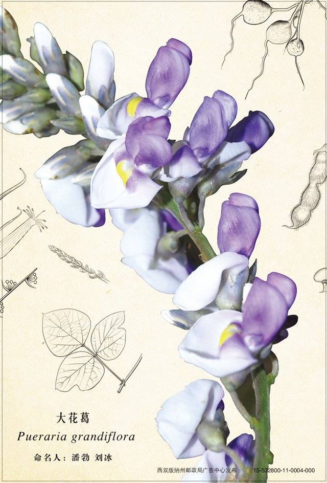 近日,版纳植物园科学传播与培训部根据该园科研人员潘勃等发现并命名的一个豆科新种——大花葛(Pueraria grandiflora),与当地邮政部门合作推出了一套以潘勃拍摄及绘制的大花葛图片作为背景的主题明信片,以此向公众传播科学研究背后的故事和文化。