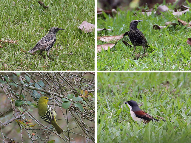观察到的鸟种:1、2为紫翅椋鸟(非繁殖羽),3为黑翅雀鹎,4为栗背伯劳)