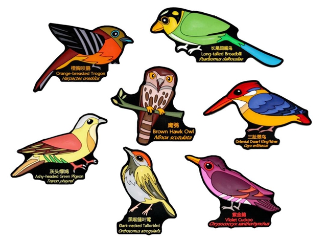 在此背景下,版纳植物园借观鸟节机会设计和制作了鸟类主题的钥匙扣、胸针、冰箱贴、马克杯、魔术头巾、贴纸、帆布袋、文件袋和T恤等10类近30款文创产品,这些产品既可以作为赠送宾客的礼品,也可以作为面向游客,尤其是自然爱好者的旅游纪念品出售。11月17日和18日观鸟节期间,这些文创产品在观鸟节机构展示环节中对观鸟节代表和游客等人群进行销售,两天共销售400余件,金额6375元。