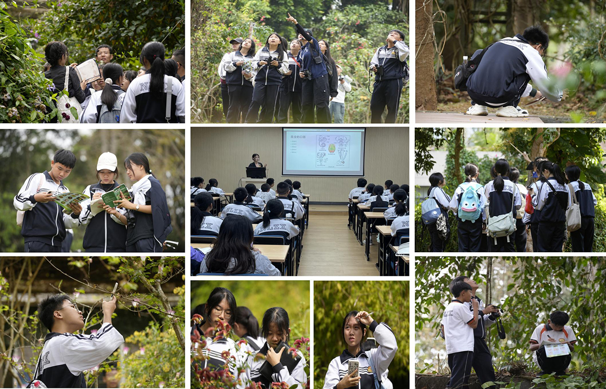 版纳植物园藤本园正值繁花盛开、生机勃勃的春日景象。学生们在景观生态研究组王成志博士及研学导师的指导下分组开展“藤本园鸟类多样性调查”“藤本植物攀爬方式调查”及“访花昆虫种类调查”的任务,各组指导老师分别介绍藤本植物概况,版纳植物园常见鸟类及昆虫识别基础知识,分组指导学生有序开展调查,通过拍照、查阅、记录和互动交流,圆满完成藤本园生物多样性探秘的研学任务。