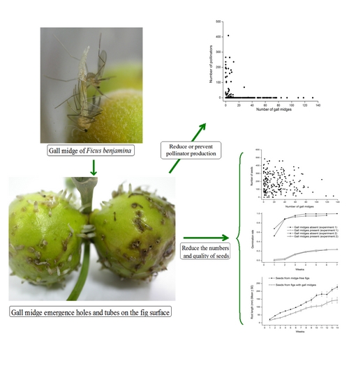协同进化组硕士研究生苗白鸽在其导师彭艳琼的指导下,研究了这种瘿蚊对垂叶榕种子及其传粉榕小蜂互惠系统的影响。研究结果显示:该瘿蚊在刚结的幼果上产卵,刺激雌花子房膨大成虫瘿,并在其中完成发育。瘿蚊寄生导致垂叶榕的传粉榕小蜂大量死于发育途中,当一个榕果内瘿蚊数量超过12只,该榕果几乎不能繁殖任何传粉榕小蜂。瘿蚊的存在也显著减少了垂叶榕的种子数量和质量,这些受瘿蚊影响的种子萌发率比正常种子萌发率降低75%,而且根的生长速度也显著地慢,寄生瘿蚊对其种子和传粉榕小蜂繁殖有致命性影响。