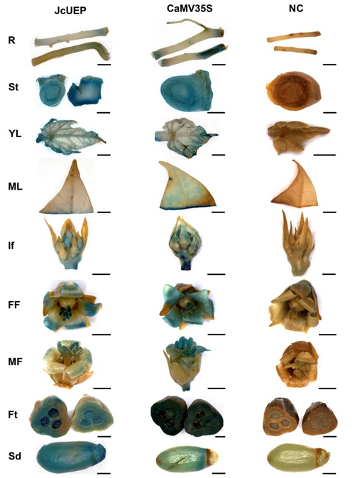 JcUEP启动子在小桐子的各个组织部中均有表达活性