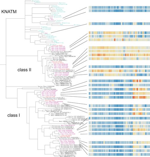 版纳植物园动植物关系组的高洁博士与其合作者从目前已完成全基因组测序的48 种植物中搜索鉴定共得到394个KNOX 基因家族成员,涵盖了整个植物界,从绿藻,苔藓,蕨类到被子植物。通过系统发育分析表明该家族可分为三个亚家族,并且该家族最早在绿藻中起源,其祖先基因跟class I 亚家族的亲缘关系最近,从而表明,class I 亚家族代表了其祖先类型。该家族基因在进化的过程中主要发生了两次大的扩张事件,第一次是由藻类到苔藓植物发生一次基因的重复从而分化出class I 和class II 两个亚家族,并且两个亚家族开始行使不同的功能:class I 基因主要维持孢子体分生细胞; class II 基因主要调控从配子体到孢子体的形态转换。第二次扩张为从低等植物到被子植物的扩张,其两个亚家族的家族成员数目在被子植物中变异较大,开始分化出新的功能,并且在双子叶植物中分化出了第三个亚家族 KNATM。
