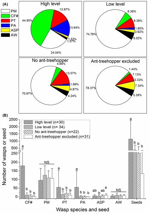 不同丰度的蚂蚁-角蝉数量对榕小蜂群落组成(a)及榕小蜂子代数量和榕树种子产量(b)的影响。