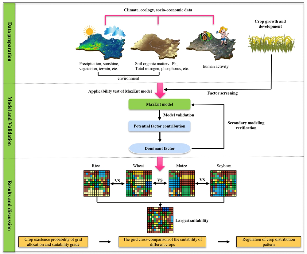随着全球气候变化与新冠疫情影响,粮食危机日益凸显。目前,我国粮食生产在很大程度上仍依赖于农业气候环境,种植结构与产量均受气候条件影响。同时,人类活动如施肥、灌溉等也会改变耕作格局,影响粮食产量。优化粮食作物在环境和人类活动双重影响下的适宜分布和种植结构,是确保粮食生产稳定的关键。