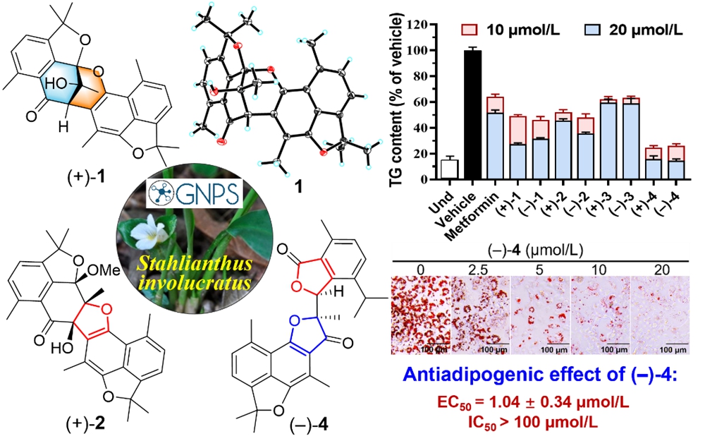 在此基础上,版纳植物园联合中国科学院上海药物研究所进一步采用质谱-分子网络(MS-MN)驱动的活性-结构一体化策略,实现对姜三七复杂提取物中潜在活性成分的快速识别与靶向分离,新发现四对结构新颖的杜松烷二聚倍半萜—Distahlianoids A–D,并总结了该类化合物形成对映体与非对映体的立体化学规律,揭示了其结构多样性衍生路径。值得注意的是,此类化合物抗脂肪生成活性较Distahlianins A−C更强,其中Distahlianoid D的EC50达1.04±0.75 μM,选择指数SI > 96,为目前该类成分中活性最强。该研究结果以“Unprecedented anti-adipogenic cadinane dimers from Stahlianthusinvolucratus: discovery via an MS-MN-based activity-structurestrategy”为题发表于国内化学综合性期刊Chinese Chemical Letters。上述活性分子也已申请并获授权国家发明专利“一类降脂抗肥胖症的杜松烷二聚倍半萜化合物及其应用”。
