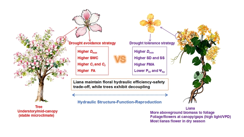 研究发现,广义羊蹄甲属藤本与树木的花水力策略存在显著差异。藤本植物的花表现出耐旱策略,其花具有更高的结构投资、更强的水力安全性以及更高的耐旱性;而树木花则表现出避旱策略,主要通过较高的水容和饱和含水量来缓冲短期水分亏缺,但整体耐旱能力相对较弱。进一步分析发现,藤本植物的花存在明显的水力效率-安全性权衡关系,即水分运输效率的提高往往伴随着抗旱能力的降低;而树木的花中未观察到这一权衡关系。这表明藤本花在平衡水分运输与水力安全方面面临更强的结构约束。此外,两种生活型在花的水力结构-功能关系及与繁殖性状的协调模式存在显著差异,反映出两者截然不同的生态适应策略。该研究首次从繁殖器官层面揭示了藤本与树木花水分利用策略的显著分化,表明花的水力特征可能是影响植物繁殖成功的重要机制之一,为解释藤本植物在季节性干旱热带森林中的生态优势提供了新的视角。研究成果突破了传统以营养器官为核心的研究框架,也为预测气候变化背景下热带森林结构和功能变化提供了重要科学依据。