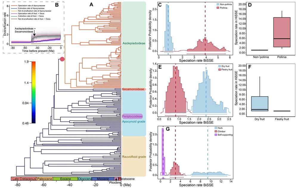 分子钟定年和祖先分布区重建分析结果显示夹竹桃科可能起源于晚白垩世中期(87.57 Ma(95% HPD:82.05–92.42 Ma))的古热带地区。马利筋亚科大约在始新世中期经历过一次物种形成速率加速事件(图2A),该亚科物种都具有花粉块。进一步综合BiSSE、HiSSE和FiSSE等多种性状相关的物种多样化速率分析结果,支持夹竹桃科中具有花粉块的物种的多样化速率显著高于无花粉块的物种(图2C和D),显示花粉块可能促进了马利筋亚科物种多样化。研究结果还支持果实类型为干果的物种比肉果类型的物种具有更高的物种多样化速率(图2E和F)。草本物种的物种多样化速率最高,其次是藤本物种,木本物种的物种多样化速率最低(图2G)。该项工作将为深入理解亚洲热带、亚热带地区植物组成的历史提供新的参考,并可以进一步提升我们对夹竹桃科物种多样化历史的认识。