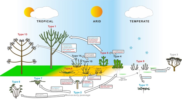 版纳植物园群落生态与保护研究组博士研究生Artémis Anest在导师Kyle Tomlinson的指导下开展了大戟属植物结构的研究工作,相关研究结果以Evolving the structure: climatic and developmental constraints on the evolution of plant architecture. A case study inEuphorbia为题在国际著名学术期刊New Phytologist上发表。该研究通过利用73个结构性状对193种大戟属植物进行了完整的数据库构建,同时建立了时间树来提供进化框架,并且利用气候数据对所有物种的潜在植物结构进化驱动力进行了分析。