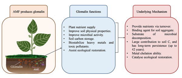 为此,版纳植物园生态水文研究组博士后Ashutosh Kumar Singh联合导师刘文杰和相关组员,对Glomalin在缓解土壤退化过程中的生态功能和环境效应进行了全面系统的整合比较分析。结果表明:(1)Glomalin通过改善土壤物理性质、养分含量、固碳能力、微生物活性、稳定污染物等过程,正向促进了退化土壤的生态修复、减缓了水土养分流失;(2)Glomalin在土壤中长期存在(≥42年),可作为微生物利用的底物、土壤团聚体的粘合物、重金属和有毒污染物的螯合剂,进而增强土壤碳固存作用等;(3)鉴于植物、土壤和AMF相互作用可以产生Glomalin,在实际应用中为了提高土壤中的Glomalin积累,可以开发转基因或杂交植物,提高根状茎的形态、位置,并通过接种AMF和有益细菌促进土壤微生物多样性及其活性;(4)未来研究需更多注重不同气候、土地利用方式和管理措施下的Glomalin变化特征,深入分析气候变化背景下(如升高CO2、氮沉降、降水变化等)Glomalin的生态功能及其对退化土壤污染物的生物固定和生态系统碳固存的影响机理。