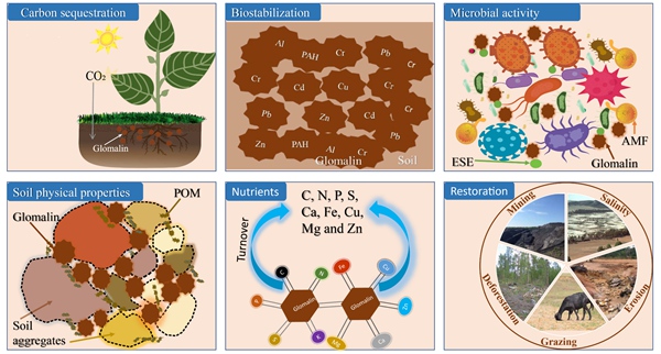 经济-社会的快速发展、人口的不断增长给土地资源造成了巨大压力,而农业的集约化也导致了普遍的土壤退化问题(如土壤侵蚀、水土养分流失、重金属及有机物污染等)。据统计,全球大约有25%的土地严重退化,有50%的土地由于人为活动而中度退化,使得当前和未来的粮食安全受到了严重威胁。因此,退化土地的可持续修复是满足全球粮食需求的重要举措。利用有益微生物,特别是丛枝菌根真菌(AMF)进行土壤改良,无疑是一种行之有效的手段和方法。研究表明,AMF可产生球囊霉素(Glomalin),有助于缓解土壤的不断退化过程。然而,对Glomalin的研究比较分散、不系统,没有综合考虑Glomalin的生态功能和环境效应。