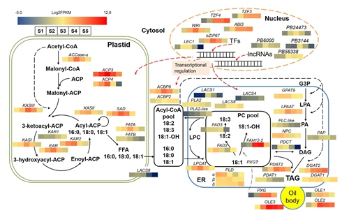 为了揭示风筝果种子累积蓖麻油酸的分子机制,版纳植物园药用植物栽培技术研究组田波博士等与加拿大阿尔伯塔大学合作者对风筝果种子发育过程中的转录组进行了比较分析。结合发育时期种子的三代全长转录组和5个种子不同发育时期的二代转录组数据,从差异表达基因中鉴定得到71个参与油脂代谢的重要基因以及246个转录因子和124个长片段非编码RNA(lncRNA),通过共表达网络分析,进一步鉴定获得与关键油脂代谢基因高度相关的转录因子57个及lncRNAs35个,分别对重要的油脂代谢基因及转录因子和lncRNAs在风筝果种子蓖麻油酸累积中的作用进行了分析,构建了展示各基因表达模式的风筝果种子油脂代谢的网络图。本研究结果将为深入开展风筝果以及植物种子累积蓖麻油酸的分子机制的研究奠定基础,将为风筝果新资源植物的开发利用提供理论依据。