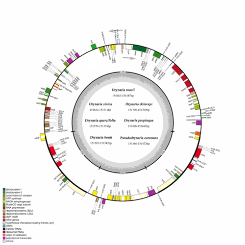 1 七种蕨类植物叶绿体基因组结构图