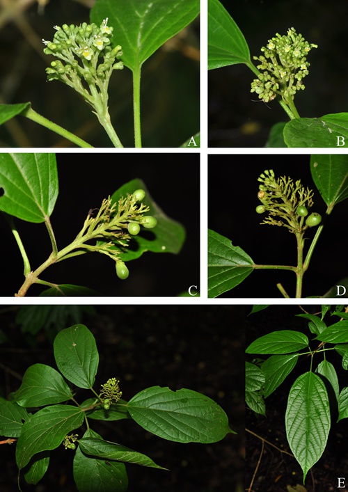 豆腐柴属是唇形科中最大的木本属之一,约有200种,主要分布在旧世界热带、亚热带地区。形态上,该种与勐腊豆腐柴(P. menglaensis B. Li)非常相似,具攀缘习性,叶子呈卵状椭圆形至椭圆形,聚伞圆锥花序;不同之处在于此种小枝和叶柄密被短柔毛,花绿色或黄绿色,雄蕊伸出花冠,果期花萼明显2-3裂。该新种于19世纪80年代引种自缅甸东北部克钦邦八莫县(Bhamo),但详细的采集地点并未记录。自2011至2017年,该研究组人员多次在缅北克钦邦开展植物多样性野外调查,均没有发现其在野外的分布情况。通过查阅相关标本和文献,认为此种为一新种,以其引种的来源地来命名该种。研究结果以Premna bhamoensis(Lamiaceae, Premnoideae), a new species from Kachin State, northeastern Myanmar为题发表在国际植物分类学期刊PhytoKeys 上。