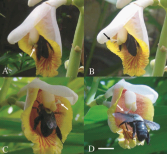 马来良姜(Alpinia mutica)两型花花柱在不同开花阶段柱头的位置。A. 上举型花在上午。B. 上举型花在下午。 C. 下垂型花在上午。D. 下垂型花在下午。箭头所示为柱头位置。标尺=1cm。(任盘宇摄)