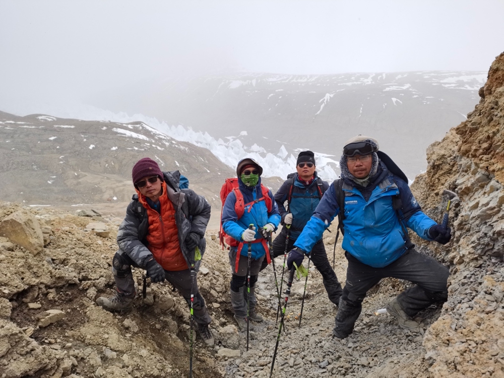 苏涛研究员(左一)及其团队在海拔5800米的希夏邦马峰野博康加勒冰川附近开展古生物科考