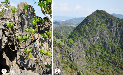 (1)生长在石灰岩裸岩上的楔叶榕;(2)滇东南地区现生石灰岩灌丛植被
