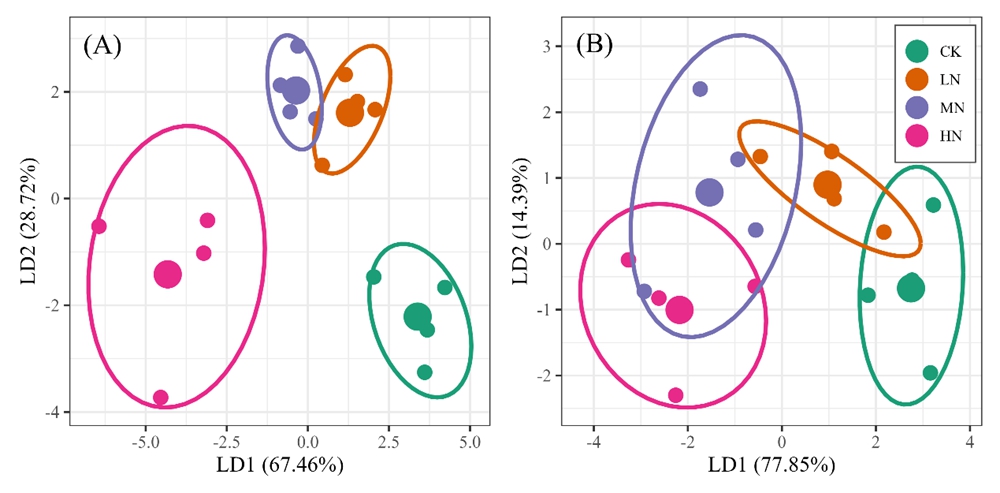 图1 基于线性判别分析(LDA)展示的不同氮添加处理下叶片(A)和根系(B)的生物地球化学生态位分化。图中椭圆表示围绕各处理组质心的95%置信区间。