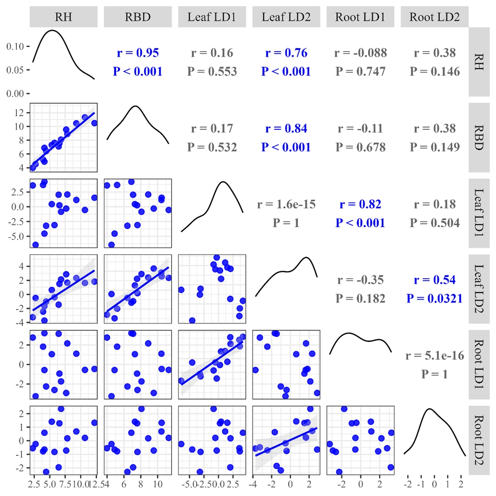 图2. 叶片和根系元素组的线性判别分析(LDA)轴与幼苗株高(RH)及基径(RBD)相对生长速率之间的Spearman相关矩阵。前两个判别轴(LD1和LD2)表征了元素含量及其计量比的综合变异信息。