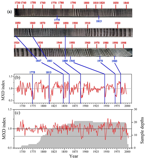 大果红杉年轮照片及其指示的虫害爆发导致的生长下降和晚材密度降低