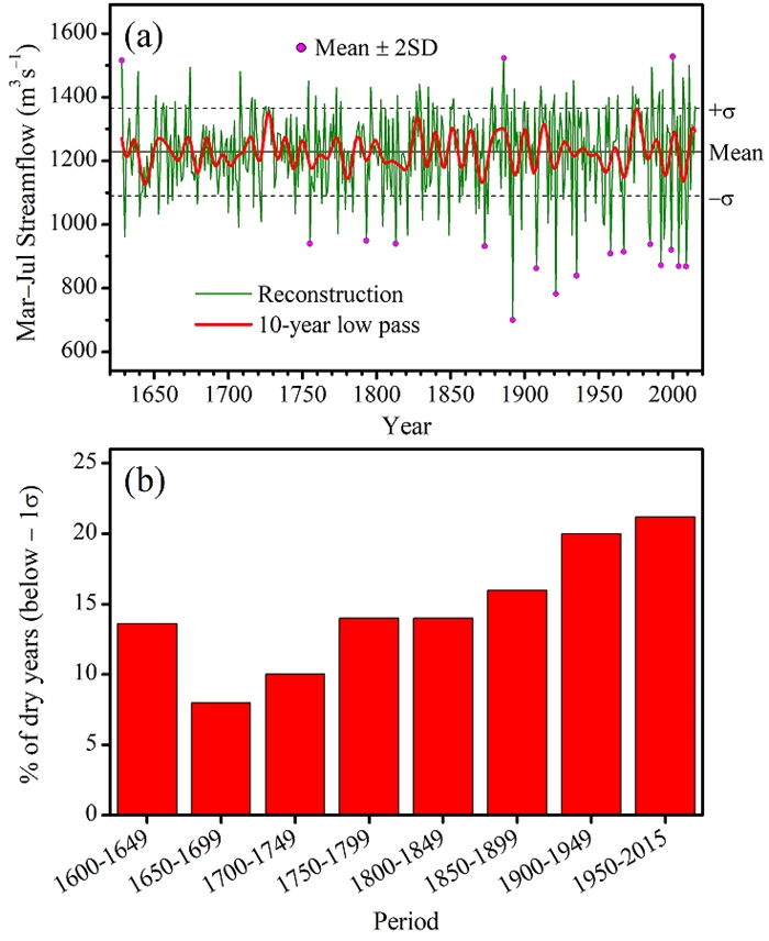 图:(a)树轮重建的1628年以来Karnali流域3月-7月河流径流量变化;(b)每50年极端低流量(干旱)发生的频次统计