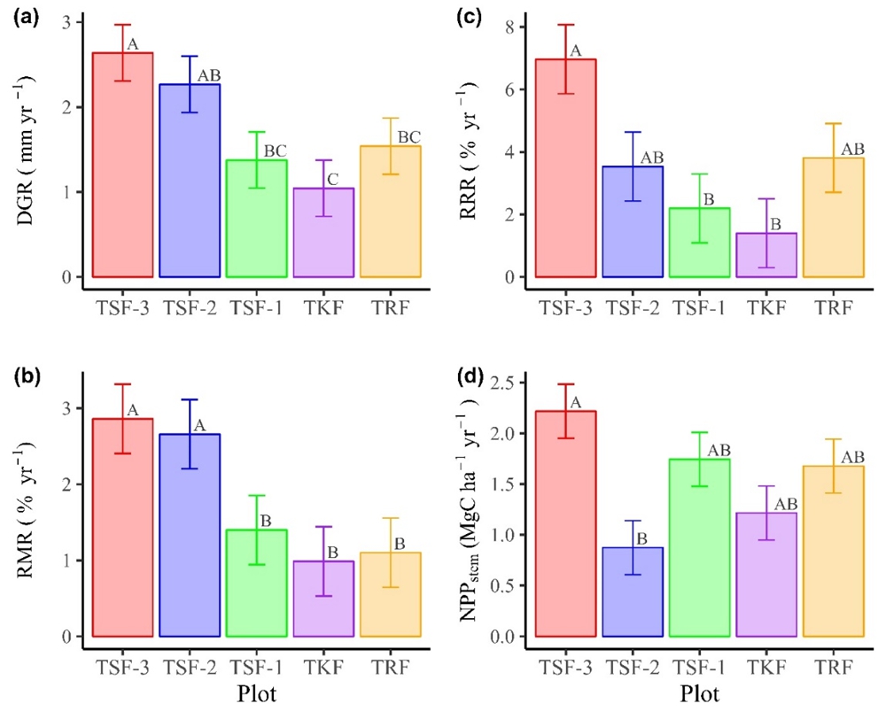 热带森林是陆地生态系统重要的碳汇,然而目前对于不同演替阶段热带森林的群落动态和碳汇能力如何响应气候变化方面的研究较少。中国科学院西双版纳热带植物园(以下简称“版纳植物园”)的科技人员,依托西双版纳热带雨林生态系统研究站的长期监测数据,分析了环境因子对2004-2020年间西双版纳勐仑地区五个热带森林样地树木直径生长率、死亡率、更新率以及树干净初级生产力(NPPstem)的影响。这五个森林样地包括三个热带次生林(演替早期的TSF-2、TSF-3和演替晚期的TSF-1)以及两个热带原始林(热带季节雨林和热带喀斯特森林)。