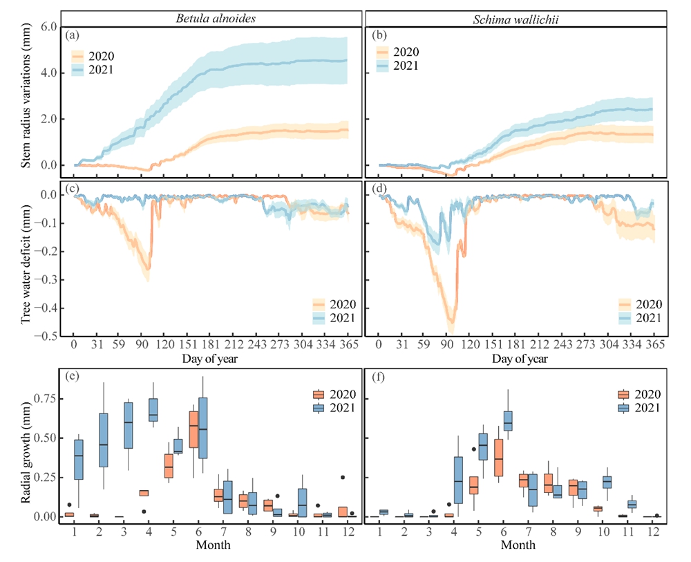 图2 2020年和2021年西南桦(Betula alnoides)和西南木荷(Schima wallchii)径向变化(a,b)、水分亏缺(c,d)以及月生长量(e,f)的差异。