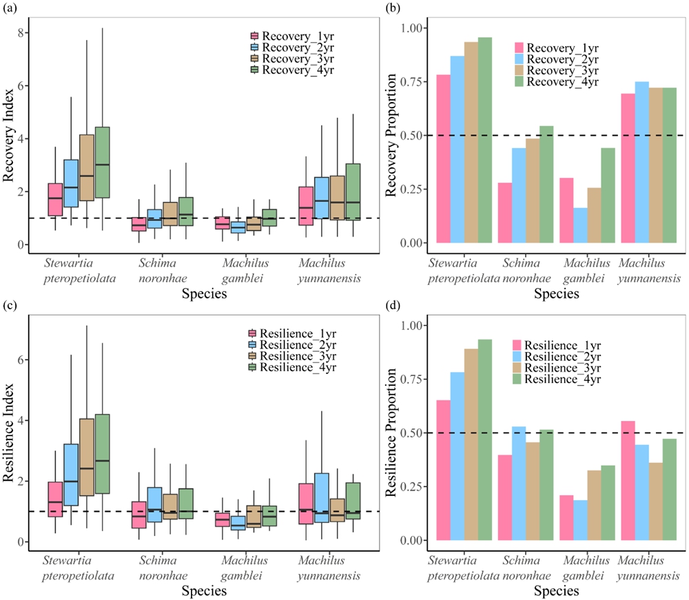 图1:哀牢山4个常绿阔叶种在极端降雪后不同年的恢复力(a)和弹力指数(c)箱形图。4个树种在极端降雪后不同年恢复力(b)和弹力指数(d)≥1的个体占比。
