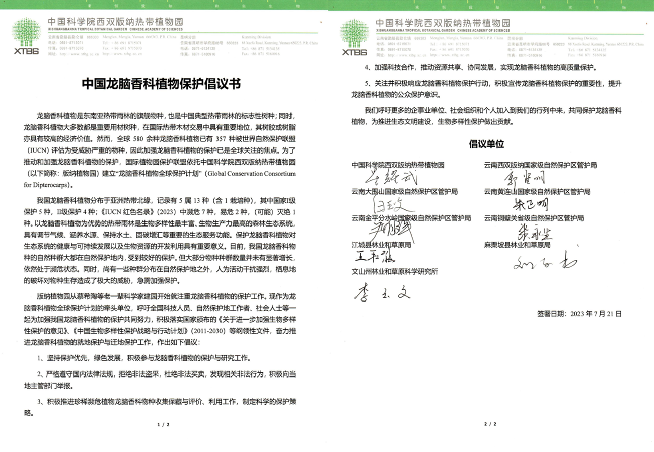 7月21日,在中国科学院西双版纳热带植物园(以下简称“版纳植物园”)主办的珍稀物种龙脑香科植物保护科技合作会议上,版纳植物园、云南大围山国家级自然保护区管护局、云南黄连山国家级自然保护区管护局、云南金平分水岭国家级自然保护区管护局、云南西双版纳国家级自然保护区管护局、云南铜壁关省级自然保护区管护局、江城县林业和草原局、麻栗坡县林业和草原局、文山州林业和草原科学研究所9家单位共同发起和签署《中国龙脑香科植物保护倡议书》,呼吁全国科技人员、自然保护地工作者、社会人士等共同努力加强我国龙脑香科植物保护,积极落实《关于进一步加强生物多样性保护的意见》、《中国生物多样性保护战略与行动计划》(2011-2030)等纲领性文件,奋力推进龙脑香科植物的就地保护与迁地保护工作。
