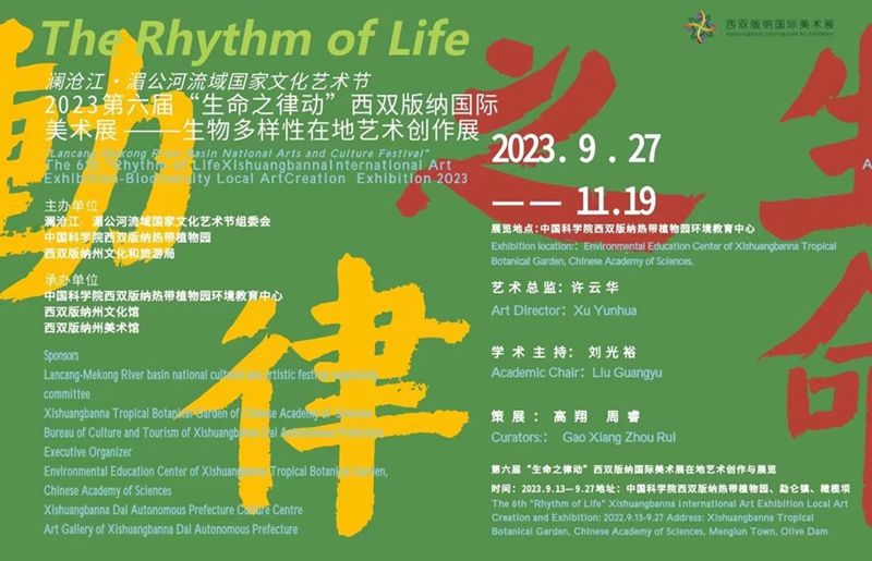 “生命的律动”由澜沧江 湄公河流域国家文化艺术节组委会、中国科学院西双版纳热带植物园及西双版纳州文化和旅游局联合主办,版纳植物园环境教育中心、西双版纳州文化馆和州美术馆承办,中央美术学院高翔先生和西双版纳州文化馆副馆长周睿先生为策展人。此次展览以西双版纳的生物多样性为创作主题,艺术家们在版纳植物园集中在地创作两个星期,共展出15位艺术家的50多件作品,包含油画、木雕、书法、装置、摄影、版画、实验艺术、诗歌、纪录片等,以当代艺术的多种技法,描绘热带雨林的神奇与美丽。