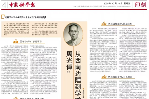 近日,《中国科学报》发表专题报道《周光倬:从西南边陲到学术殿堂的传奇》,深度讲述了西双版纳热带植物园早期建园元勋、地理学家周光倬先生波澜壮阔的学术人生。