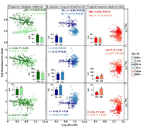 研究还证实,气候因子(温度与降水)主导土壤C、N、P化学计量的大尺度地理格局,而地形异质性(如地形崎岖度)则通过影响微环境与植物多样性,进一步调控局部养分保持能力。该研究不仅深化了对生物多样性—生态系统功能关系的理解,也为推动基于自然的森林可持续经营、增强森林生态系统应对全球变化的韧性提供了重要的科学依据。