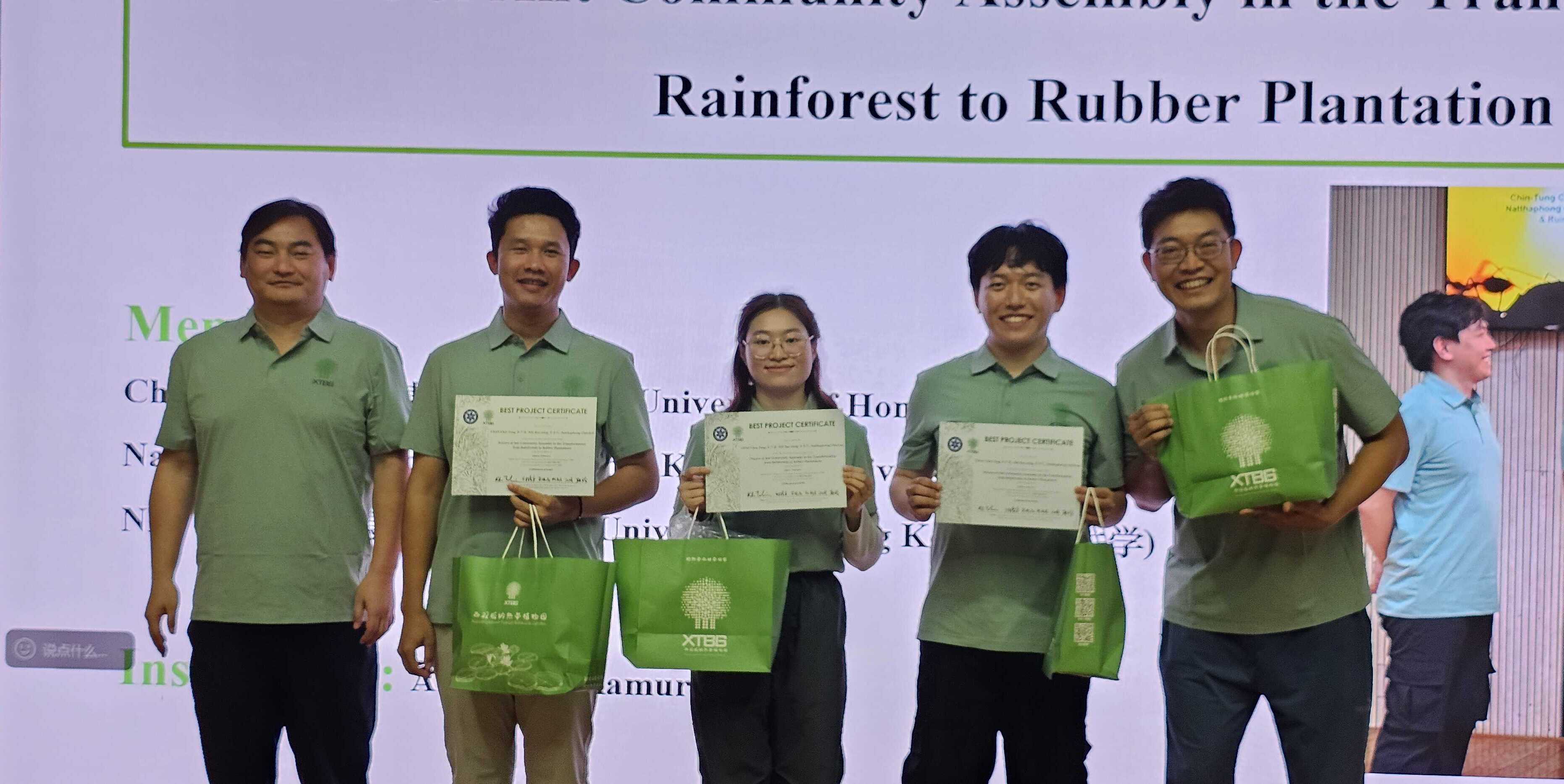 12月8日,培训班举行课程研讨会暨闭幕式。8个小组依次汇报研究成果,涉及物种间相互作用与行为生态、生物多样性监测与新技术应用、生态系统功能与全球变化响应、保护教育与社会生态学、景观尺度与群落生态等多方面内容,涵盖生态学、植物学、保护生物学、保护教育等多学科领域,展现了学员良好的科研素养与团队协作精神。其中,Drivers of Ant Community Assembly in the Transformation from Rainforests to Rubber Plantations(《在从热带雨林到橡胶林的不同生境中蚂蚁群落构建的驱动因素》)课题凭借扎实的研究设计、清晰逻辑与深入分析获评“最佳课题”。该课题由3名来自香港大学与泰国农业大学的学员在林冠生态学研究组组长、研究员Akihiro Nakamura指导下完成。
