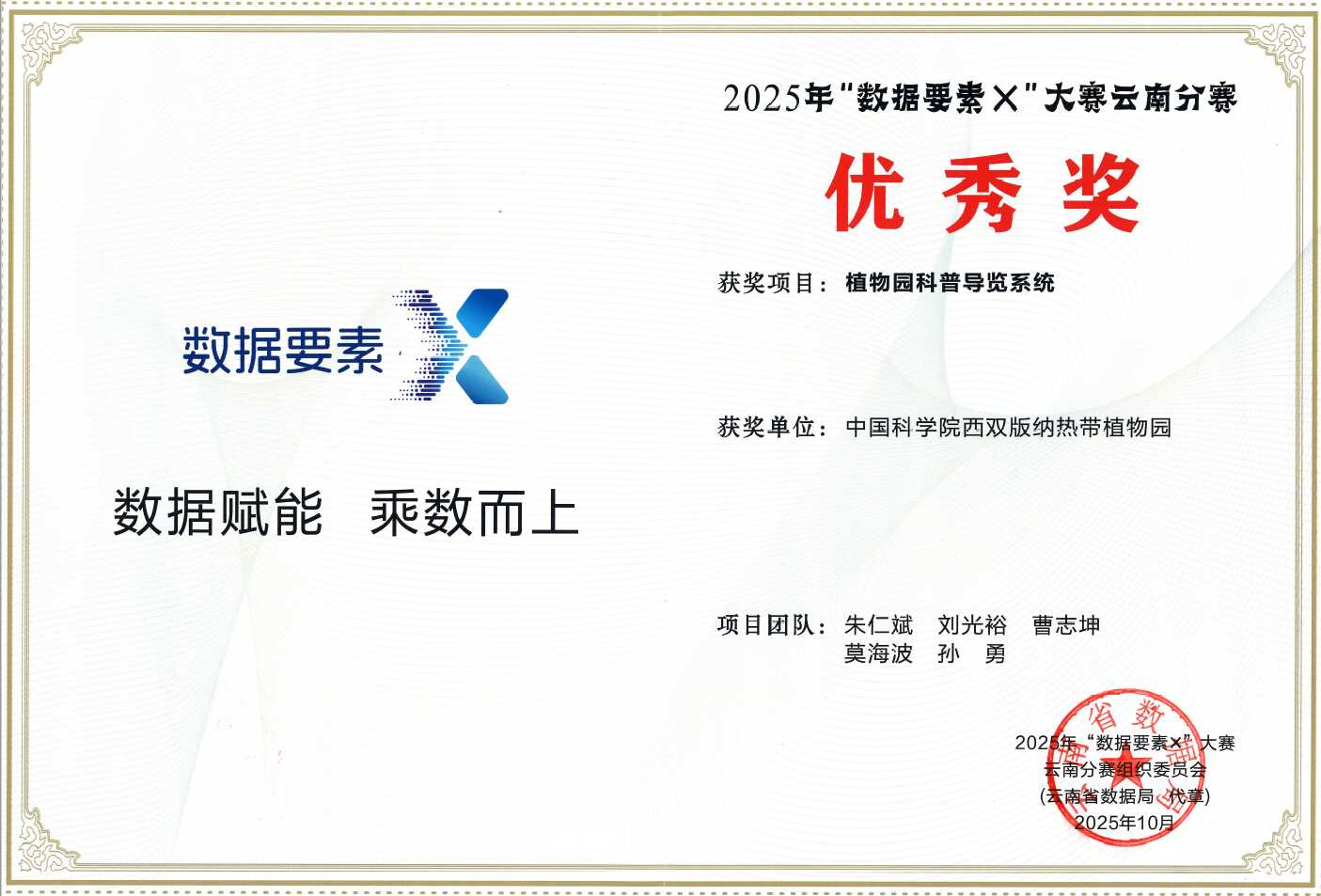 10月13日,由国家数据局、云南省人民政府指导,云南省数据局会同省委网信办、省工业和信息化厅等19个部门共同举办的2025年“数据要素×”大赛云南分赛颁奖仪式在昆明举行。中国科学院西双版纳热带植物园科技信息中心和环境教育中心联合开发的“植物园科普导览系统”在激烈竞争中脱颖而出,斩获文化旅游赛道优秀奖,展现了数据要素与生态文明教育的创新融合成果。
