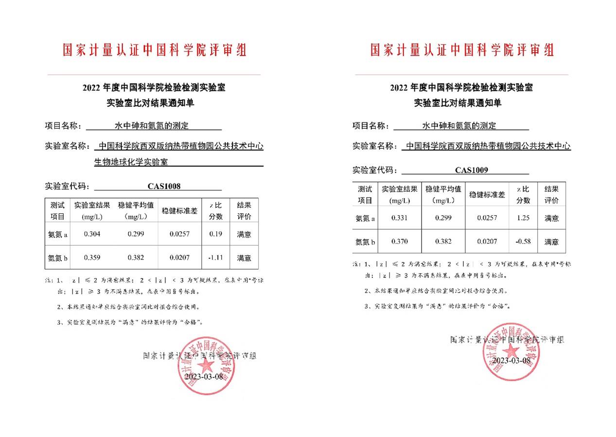 2022年10月,公共技术中心报名参加了由国家计量认证中国科学院评审组组织的“水中砷和氨氮的测定”实验室间比对项目。2023年4月6日,中心收到比对结果通知单,结果均为“满意”(图1和图2)。