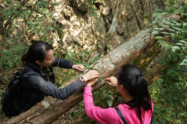 回归地点选择在情侣峰,这里较为开阔,光照条件适宜,也易接触到雨露,适合以上三种兰花生长,是一个比较理想的地点。在强调了回归中的注意事项后,大家测量并记录了所选植株的相关数据,便在树干上或岩石间找寻合适的位置,将植株认真固定好,挂上标牌。通过实作,大家对兰花回归有了更多的了解和关注,为之后面向公众开展此活动积累了经验。