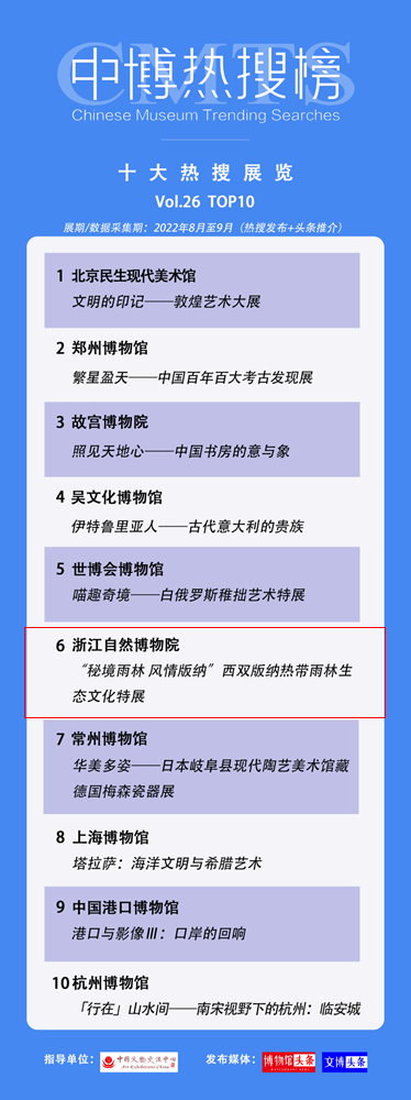 9月14日中博热搜榜发布了最新一期(第26期)“博物馆十大热搜展览推介”,中国科学院西双版纳热带植物园和浙江自然博物院联合推出的“秘境雨林·风情版纳”西双版纳热带雨林生态文化特展登上了本期博物馆十大热搜榜单,本期推介展览为2022年8至9月受到全国网友高频搜索和较高关注的十大文博展览。