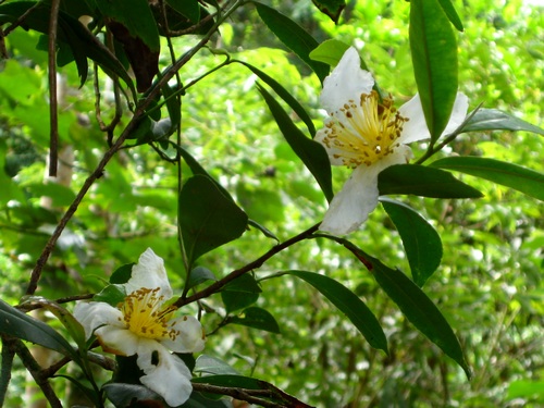 云南山枇花属于山茶科,分布在云南腾冲、景东、昆明、文山等及缅甸北部海拔1100-2400米的阔叶林下或常绿灌丛中。树高3-8米,常绿。叶薄革质,顶端微凹,边缘具锯齿。花白色,单生或有时3-5朵的短总状花序,小苞片多,花瓣5,近圆形;雄蕊多数,长1 - 5厘米。蒴果圆柱形,木质。因其花药呈黄色,又称为黄药大头茶。其花期11-12月,果期次年8-9月(云南植物志)。