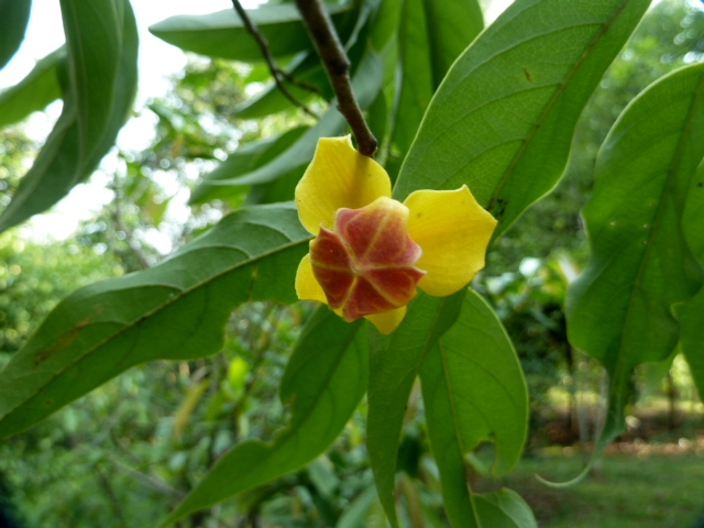 山蕉(Mitrephora maingayi)是番荔枝科银钩花属小乔木。叶革质,长圆形或长圆状椭圆形,侧脉两面稍凸起。花冠成三角形,花单生或数朵生于总花梗上。初时白色,后变为黄色。萼片阔卵形,外被绒毛。花瓣2轮6片,外轮花瓣倒卵状矩圆形,基部具短而阔的爪,内轮上部心形,边缘黏合,下部具长爪。单花结果1-3个,幼果时粉绿色,卵状或短圆柱状,果柄粗壮。成熟时为黄色,到变褐色时就脱落。花期6月上旬-11月中旬,果期10月-翌年6月。