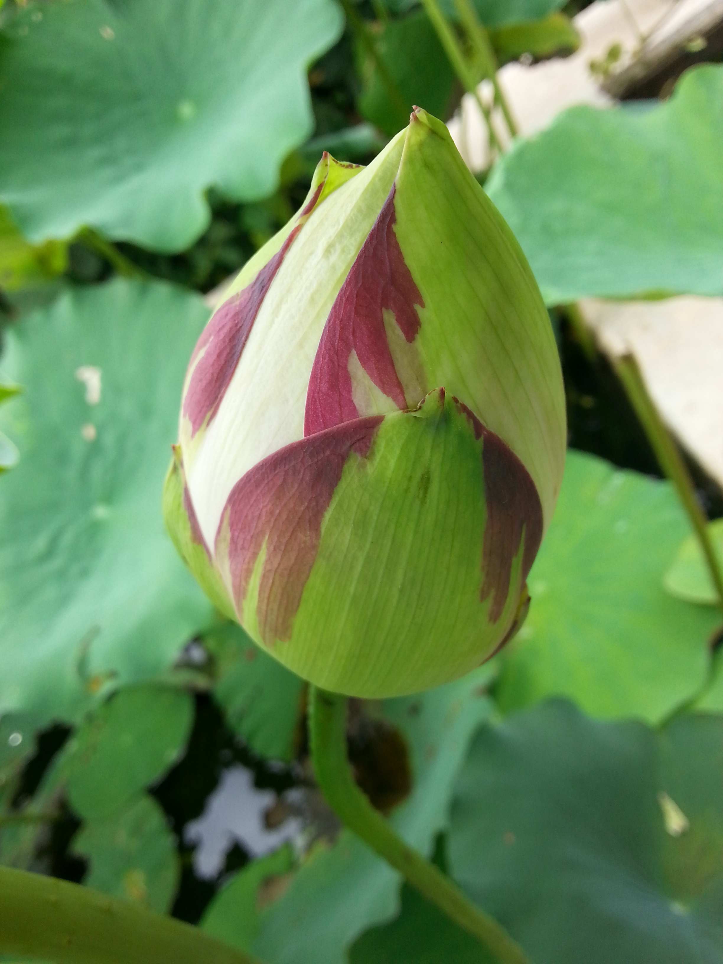 ‘大洒锦’荷花品种发现于云南文山普者黑地区,本次开花的种源引种于 杭州天景水生植物园,该品种属于中国莲种系大株型重瓣类复色型荷花。该品种花蕾圆桃型,绿色,萼片边缘有紫红晕,花复色,大部分为白色,瓣基淡绿黄色,边缘嵌红色斑块,内瓣顶端有绿色斑块。花径18-25cm,着花较多,瓣数96(71~113)枚。雌蕊部分瓣化,部分发育正常,能够结莲子。该品种无论在群体花期、着花密度、花蕾形、花蕾色、还是在花径、花色、花型、花瓣数、花瓣长、花瓣宽、花柄高等主要观赏性状的综合观赏价值均位于众多荷花品种之首,实属荷中极品。花瓣中分布着独特色斑,在近千种荷花品种中,十分罕见,也许将来可以作为研究“跳跃基因”的一种好材料。