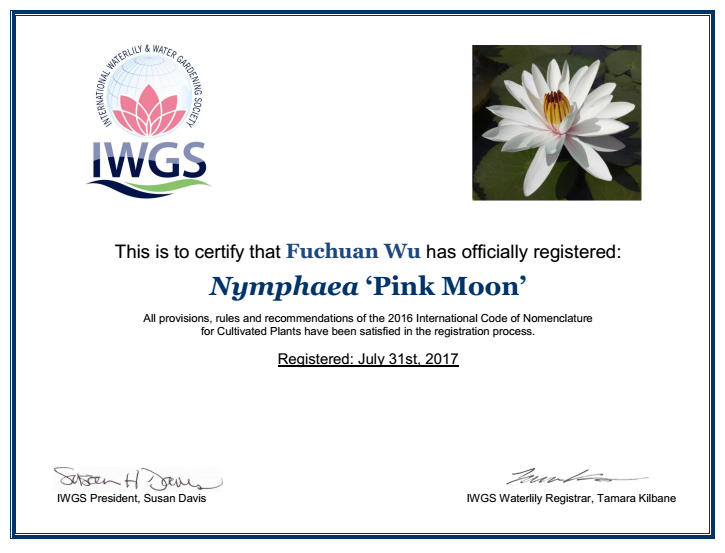 8月3日,从国际睡莲水景园艺学协会(International Waterlily & Water Gardening Society、IWGS)获悉,版纳植物园高级实验师吴福川培育的睡莲新品种‘粉月亮’(Nymphaea Pink Moon’),获得国际睡莲水景园艺学协会主席Susan Davis和睡莲登录权威amara Kilbane的认可,收到国际睡莲水景园艺学协会授予的认证证书,证明该品种名已获得了国际睡莲品种登录。