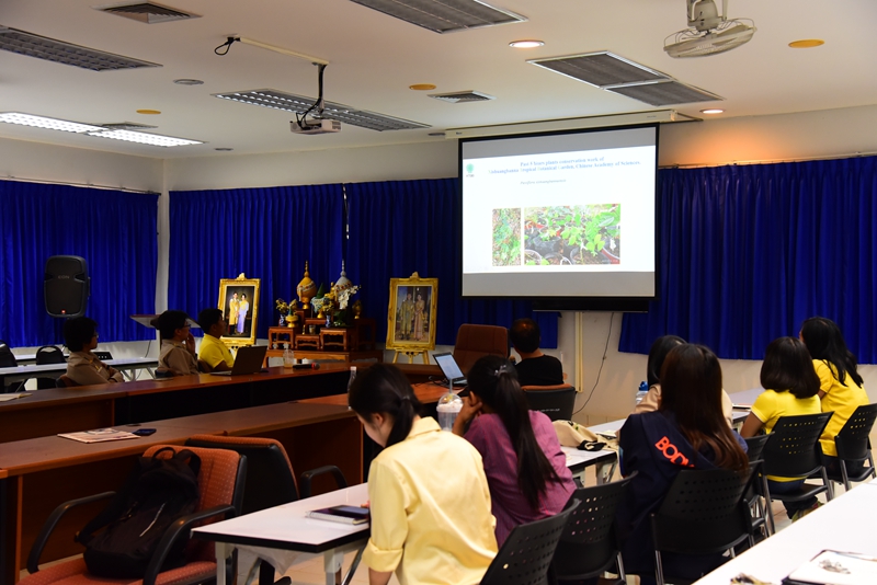 座谈会上Piyasaket代表诗丽吉植物对申健勇及肖云学2位的到来表示热烈的欢迎,他说版纳植物园与诗丽吉植物园都是地处热带的植物园,在物种保护、科学研究等方面具有许多相似及相互学习之处,版纳植物园在活植物收集与管理方面不仅在中国具有很高的水准,在世界上也是具有较高的地位,尤其对东南亚地区植物园的建设具有引领示范作用,希望此次的交流能够促进双方在活植物收集与管理工作的开展。随后,诗丽吉植物园活植物收集主管(Curator)Wattana Tanming博士做了关于诗丽吉植物园在活植物收集与管理方面的报告,详细介绍了该园活植物收集与管理的构架、人员组成、收集的主要类群、面临的问题以及未来工作目标等内容。版纳植物园申健勇、肖云学分别做了题为“Past 5 Years plants conservation work of Xishuangbanna Tropical Botanical Garden, Chinese Academy of Sciences.”、Horticulture , Living plants collection and management of XTBG”,报告对我园的基本状况做了简要介绍,在物种保育、本土植物全覆盖保护计划及滇西南极小种群植物调查等项目的工作进展、专类园活植物管理、活植物数据库管理、景观营造、特色植物展等内容进行了详细的汇报。